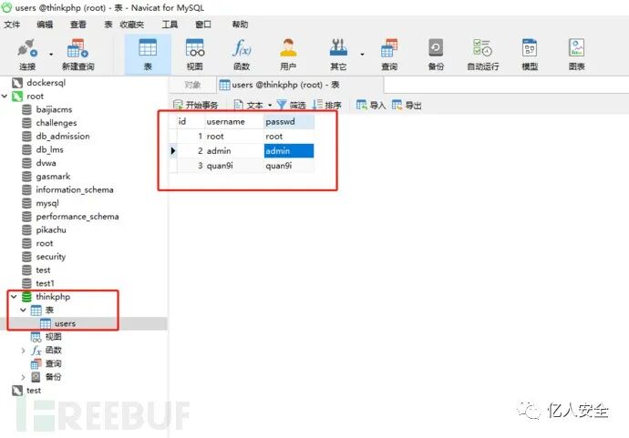 我们需要在本地Mysql中新建一个thinkphp数据库用于测试,然后在其中新建一个users数据表,包括id、username、passwd三个字段