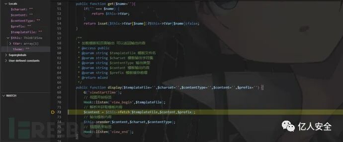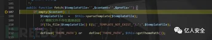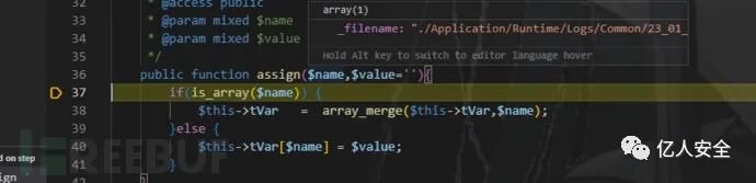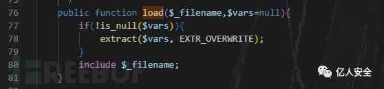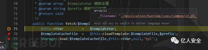 可以发现这里是调用Behavior\ParseTemplateBehavior类中的run方法处理$params,我们跟进run方法,寻找哪里对日志文件路径进行了处理,最终找到ThinkPHP\Library\Think\Template.class.php文件下的fetch方法loadTemplate函数是读取文件路径的,而后这里用load函数对其进行了处理,我们跟进此函数$_filename是之前获取到的的缓存文件路径,$vars是带有变量_filename的数组,这里的$vars不为空,因此使用extract方法的EXTR_OVERWRITE默认描述对变量值进行覆盖。