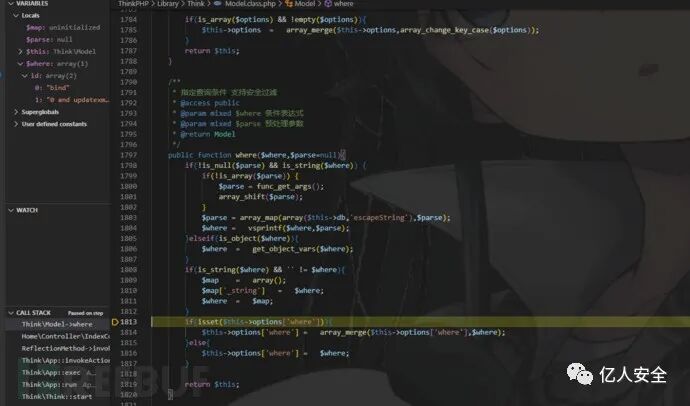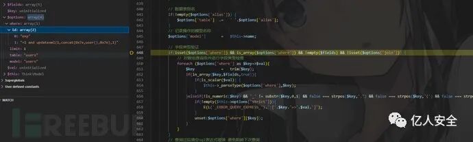 这里的话我们的where是数组,所以条件不满足,直接pass,第二个if同理,然后第三个的话,我们这里并未对optinos[where]进行赋值,所以就会走else,把$where的值赋给他,接着看