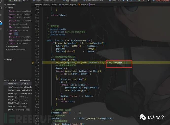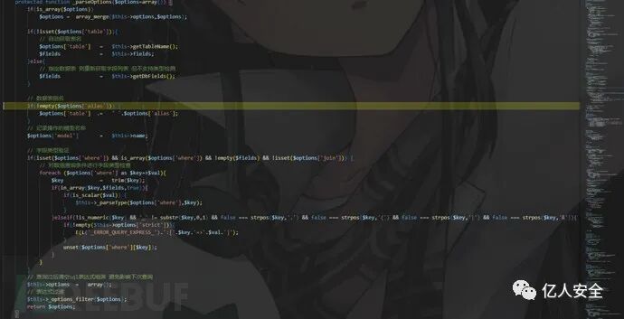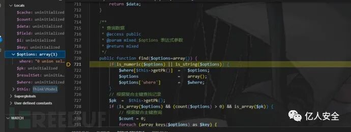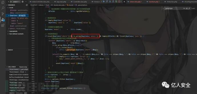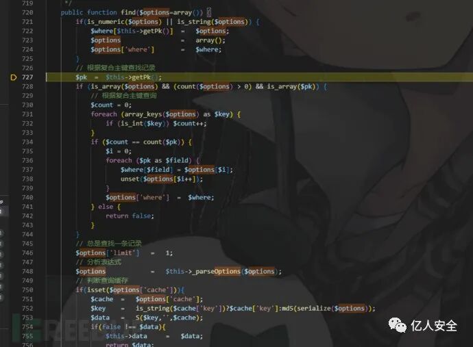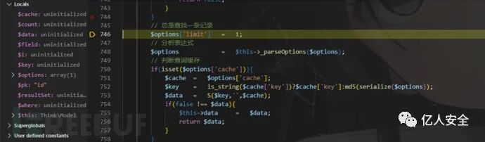 到find方法这里,第一个if语句,我们这里$options为数组,所以直接pass,第二个if语句,我们的$pk值为id,而非数组,所以也pass,到下面跟之前一样,参数被函数_parseOptions包裹,接下来跟进这个函数