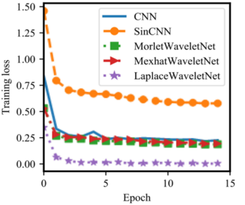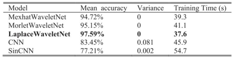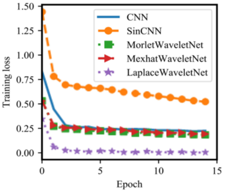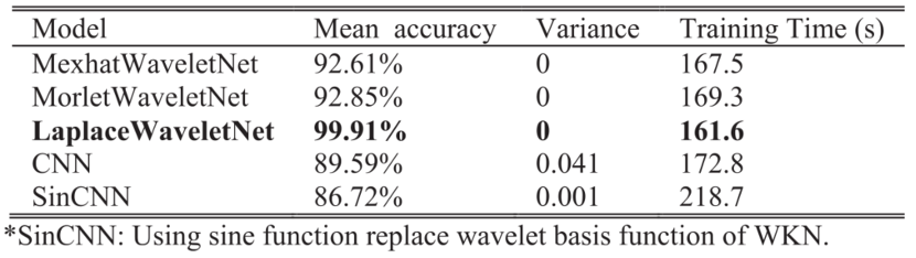 从结果可得,三种WKNs的平均分类准确率都高于传统CNN和SinCNN,而拉普拉斯小波网络的平均准确率比CNN提高了14%以上。此外,与三种WKNs和CNN相比,SinCNN收敛到稳定损失需要更多的训练时间。