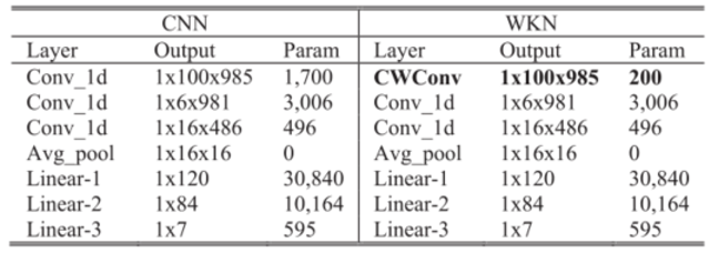 在传统的卷积层中,要学习的参数个数是核的个数F与核的长度L的乘积,即F×L。然而,CWConv层只需要F × 2个参数(一个缩放参数和一个转换参数足以设计每个内核)。因此,与传统卷积层相比,CWConv层学习到的参数减少,CNN与WKN的体系结构参数对比如表4所示。