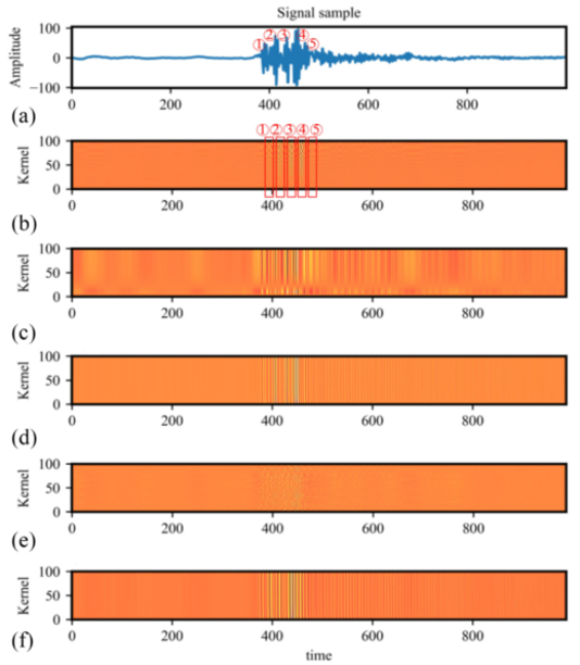 为了清楚地解释CWConv层,讨论了三种层(即CWConv层、传统Conv层和正弦函数核)的特征映射之间的差异。此外,还说明了训练前和训练后的波形差异,提取的特征图及其核波形分别如图8所示。