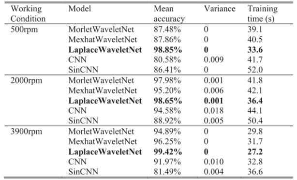 从结果可得,在每种工况下,设计的WKNs都优于传统的CNN和SinCNN。但在第一种工况下,拉普拉斯小波网络的性能远远优于其他两种WKNs,这说明尽管由转速引起的振动冲击比其他两种工况要弱,但拉普拉斯小波网络对信号振动分量的匹配更好。