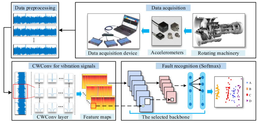 机械系统中的预测和健康管理 (PHM) 已广泛应用于实现预测性维护,传统上的PHM包括传感器信号采集、特征提取和故障分类。然而传统方法依赖于手动选择的特征,不仅耗时耗力,不适用于处理大量数据,且最终预测或分类的效率不高。近年来基于深度学习 (DL) 的方法因为具有强大的特征学习能力,从而可以有效克服传统方法的限制。虽然基于 CNN 的 DL 方法在 PHM 中取得了成功应用,但CNN 在机械故障诊断中被认为是一个黑匣子并且不可解释,这无法深入了解它们如何以及为什么可以做出最终决定。这可能不仅会挑战决策本身的可信度,还会限制 CNN 进一步改进以适应更广泛的应用。本文探讨了一种设计可解释的卷积核以提取振动信号中嵌入的与缺陷相关的影响分量的方法,其中连续小波卷积 (CWConv) 层被设计用来替换第一个卷积层,目标是帮助 CNN 发现具有特定物理意义的内核。