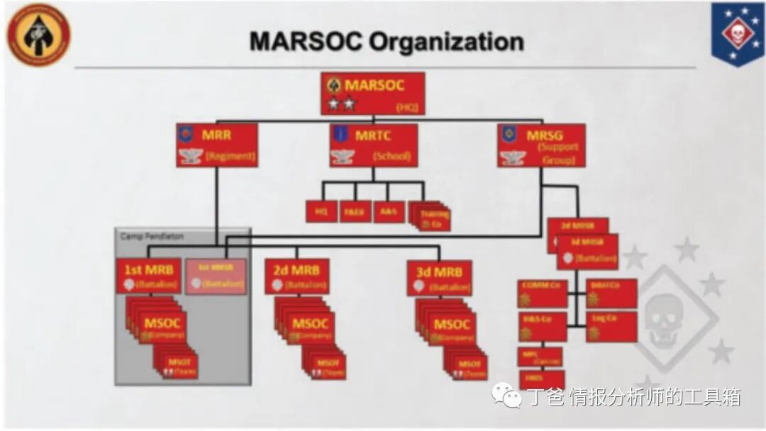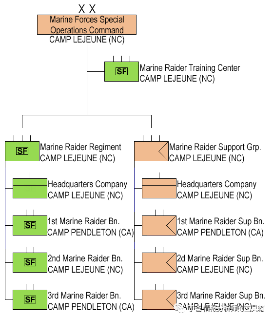 海军陆战队特种作战司令部下属机构包括:袭击者团、袭击者支援大队、突袭者训练中心