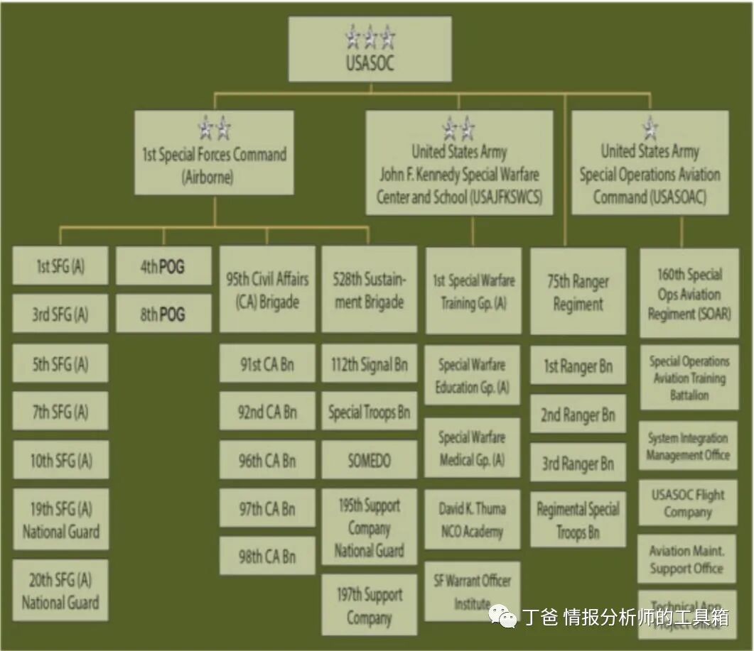 第一特种部队司令部是美国陆军特种作战司令部下属的一个师级特种作战部队司令部。该司令部成立于 2014 年 9 月 30 日,将陆军特种部队、心理战、民政和其他支援部队组合成一个单一组织,在其位于北卡罗来纳州布拉格堡的新总部大楼外运作。该部队下属单位包括特种部队、心理战小组、第 95 民政旅、第 528 维持旅。