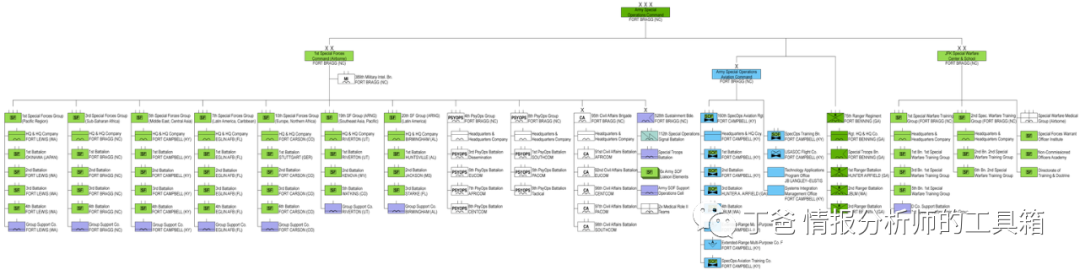 美国陆军第389 军事情报营 成立于 2015 年 3 月,下属三个连,指挥和控制多学科情报行动,以支持第一特种部队司令部 G2、下属单位和合作伙伴任务。总部公司有一家分析支持公司,拥有部门支持单位和五个区域支持团队;一个任务支持公司,拥有一个处理、开发和传播 分队,一个人力情报和地理空间情报分队,并开展特种作战信号情报课程;以及在戈登堡的额外 PED 分遣队,根据命令,它作为特种作战联合特遣部队 (SOJTF) 的一部分部署和执行情报行动。