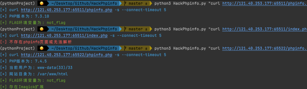 pip3 install beautifulsoup4本工具使用curl请求页面,通常来说Windows和unix都自带了curl,如果在比赛过程中需要POST或者Header传额外参数才能得到phpinfo页面,可以自行参考curl的用法