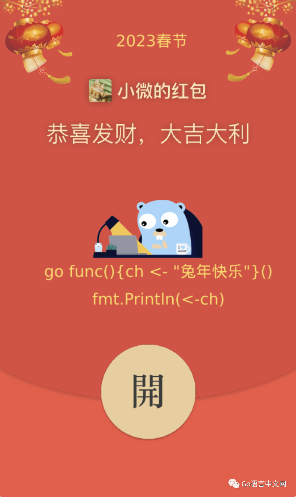 今天发现,通过视频号也可以制作红包封面,而且没有那么多审核流程,于是制作了这款 Go 红包封面,一共 500 个,先到先得。这个红包封面很好地体现了 Go 的特色,还有人说看到这个封面感觉学到了一个 Go 特性,不错不错~