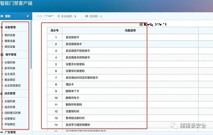 继续利用,通过收集平板上面的信息知道了用户id是xxxxxx,还知道了平板是xx科技的,然后谷歌和扫描找到了xx科技的用户管理登录界面和api文档,知道了要实现操控门禁系统需要用户apiid和apikey还要acsurl,这些信息都是登录后要找的,通过爆破无果,找xx科技的客服要了测试账号和密码看了看后台也没有什么能利用的洞