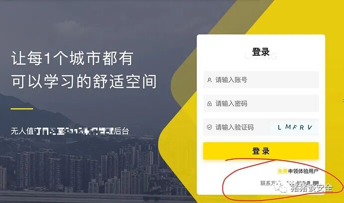 这里21,22的利用肯定是放到后面没办法了再回来搞,看了看svn也没什么可以搞的,几个页面也没什么信息,宝塔和think6.0.2,搜了下相关漏洞也没什么能搞的,只能靠自己了,在自习室系统的登录界面(上面说的xx科技登录是iot设备的登录界面)发现了可以找客户要试用账号,于是加上客服微信要到了试用账号: