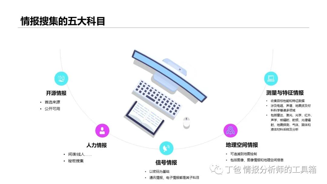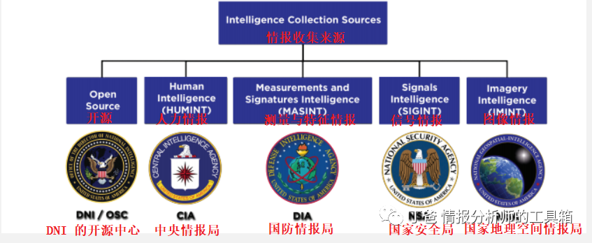 今天给大家介绍美国情报界公认的五大情报搜集科目:开源情报 (OSINT)、人力情报 (HUMINT)、信号情报 (SIGINT)、地理空间情报 (GEOINT)和测量与特征情报 (MASINT)。