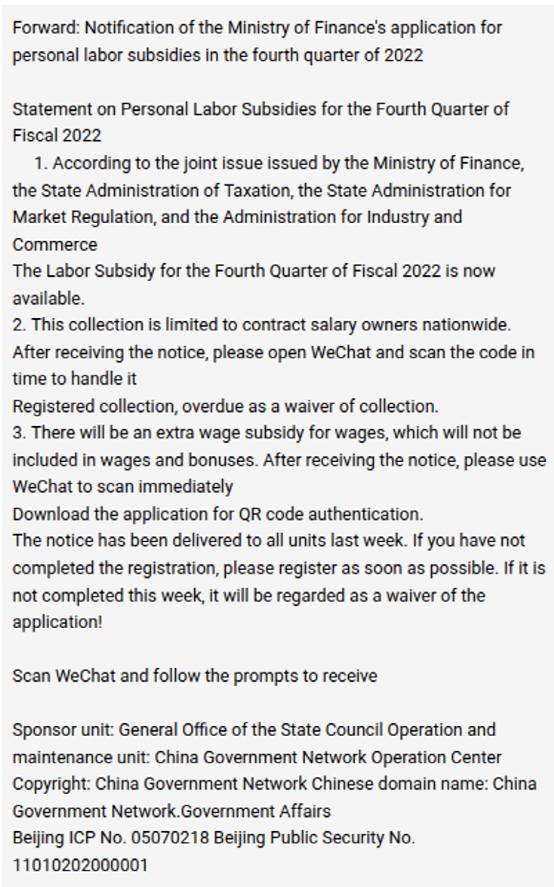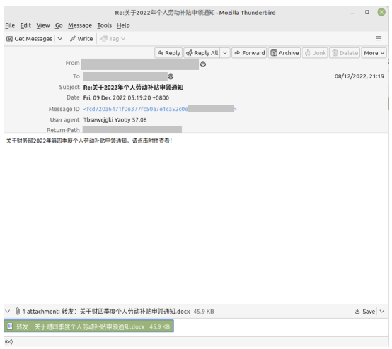 这封电子邮件试图欺骗中国财政部。翻译成英文,图1中的电子邮件主题是:“关于2022年申请个人劳务补贴的通知”。正文称,“请点击附件查看财政部2022年第四季度申请个人劳务补贴的通知!Microsoft Word附件“转发:关于财四季度个人劳动补贴申领通知.docx”翻译为:“转发:关于申请本财年第四季度个人劳动补贴的通知.docx。