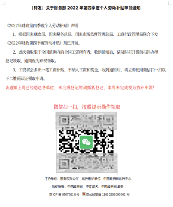 转发:关于财四季度个人劳动补贴申领通知.docx (Forward: Notice on Application for Personal Labor Subsidy in the Fourth Quarter of Fiscal Year.docx) | f941b76a33b5a1d425569a0ed689023597fd7fc3acb301ec11a37feb71dcb597 |