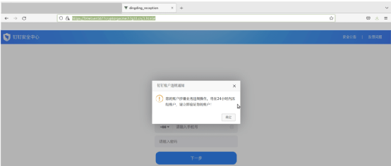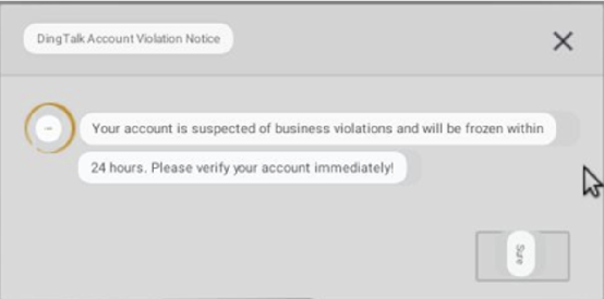 用户被定向到一个弹出的消息框,表明他们的钉钉帐户犯了一些未指明的业务违规行为,并将在24小时内未经验证而被冻结。