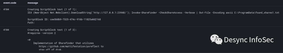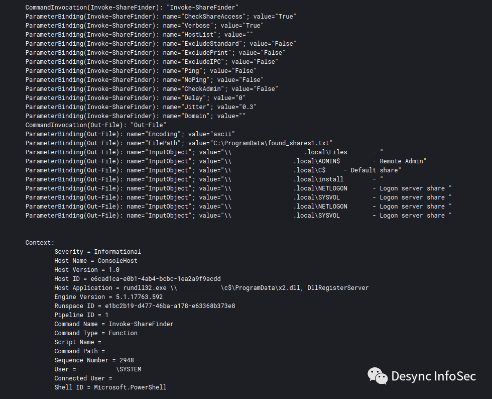 在我们过去一年的报告中有五个案例都是使用Cobalt Strike会话启动的 ShareFinder。虽然在极少数情况下我们可以通过命令行调用检测脚本执行,但更好的检测方法是检测 PowerShell 日志(https://www.mandiant.com/resources/blog/greater-visibility)。下面为攻击者的调用示例,该示例是在来自 Microsoft-Windows-PowerShell/Operational 事件 ID 4103(模块日志记录)事件中捕获的。