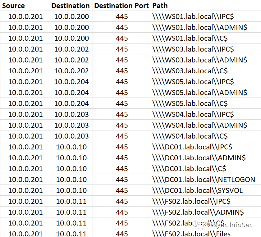 因此网络侧的检测逻辑可以同样适用于Windows 对象访问日志事件ID 5145。从源地址字段可以检测一对多的访问行为。但我们可能需要关联更多信息才能确定这是网络共享扫描行为。