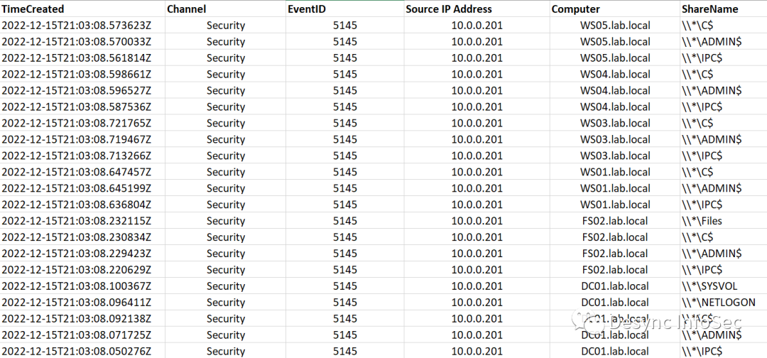 ( & (objectClass=computer) (dNSHostName=*) (operatingSystem=*) (servicePrincipalName=*))与网络侧一样,网络共享访问也可以通过主机上的网络共享审计日志检测。来自安全事件 ID 5145(https://www.ultimatewindowssecurity.com/securitylog/encyclopedia/event.aspx?eventid=5145) 能够记录对象对文件共享的访问以及源。