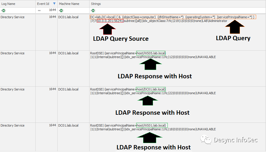 像网络侧检测那样,特殊的枚举域计算机和域用户检测行为在事件ID:1644中。事件 ID 1644 (https://www.manageengine.com/products/active-directory-audit/kb/system-events/event-id-1644.html)能够为针对域控制器进行的每个 LDAP 搜索记录一个条目,但是,这也会对检测产生大量噪音(无用日志)。默认情况下,事件ID:1644处于禁用状态,需要管理员手动启用(https://ramblingcookiemonster.github.io/Evil-LDAP-Queries/)。启用后可以在日志中看到请求源主机和查询响应结果。