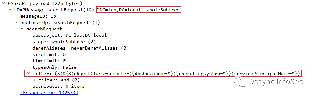需要注意的是,LDAP查询可以通过查询其他属性的方式实现。例如:上面的例子中我们查询请求中属性设置为objectClass=computer,这可以通过设置samAccountType=805306369进行等价替换。