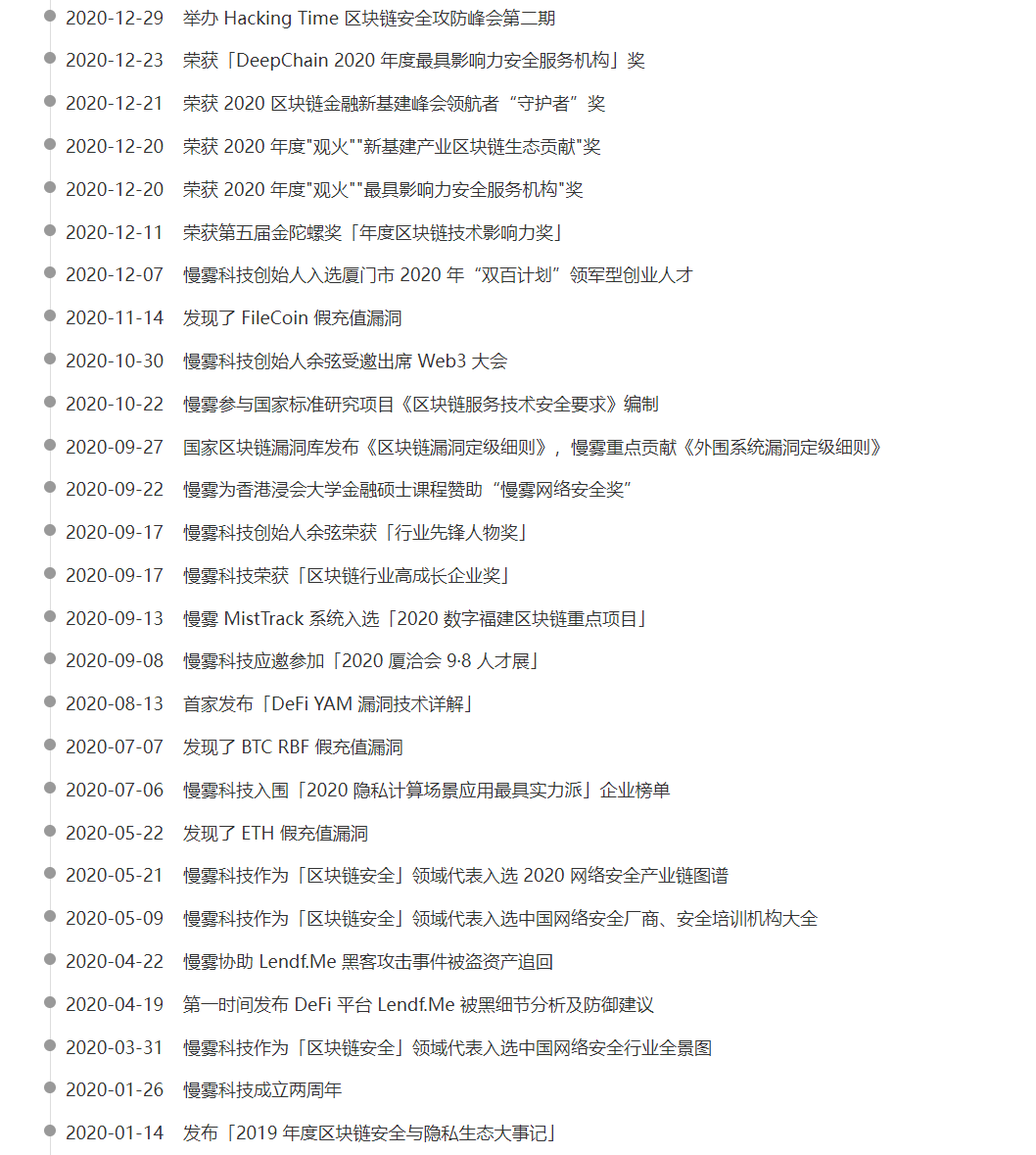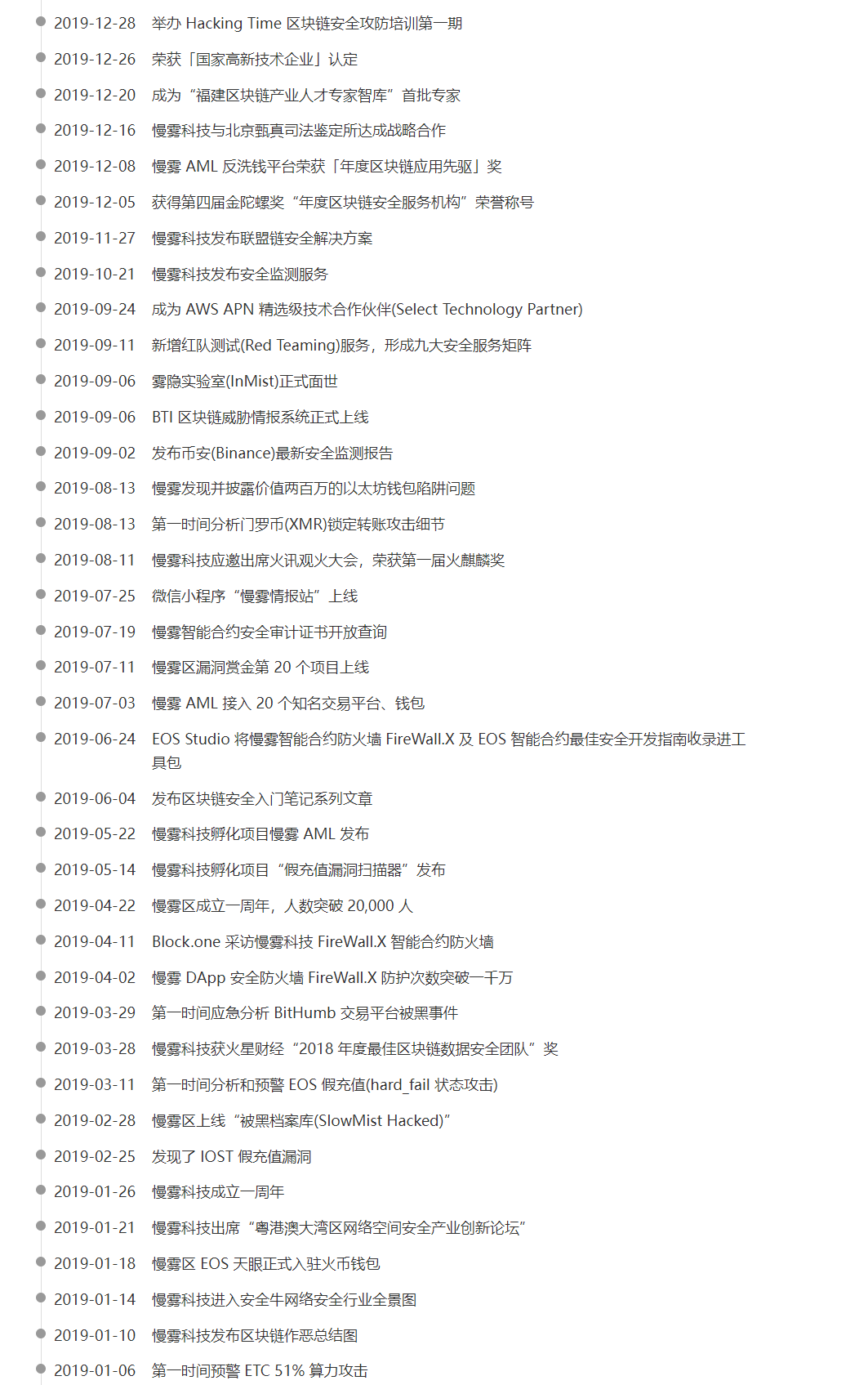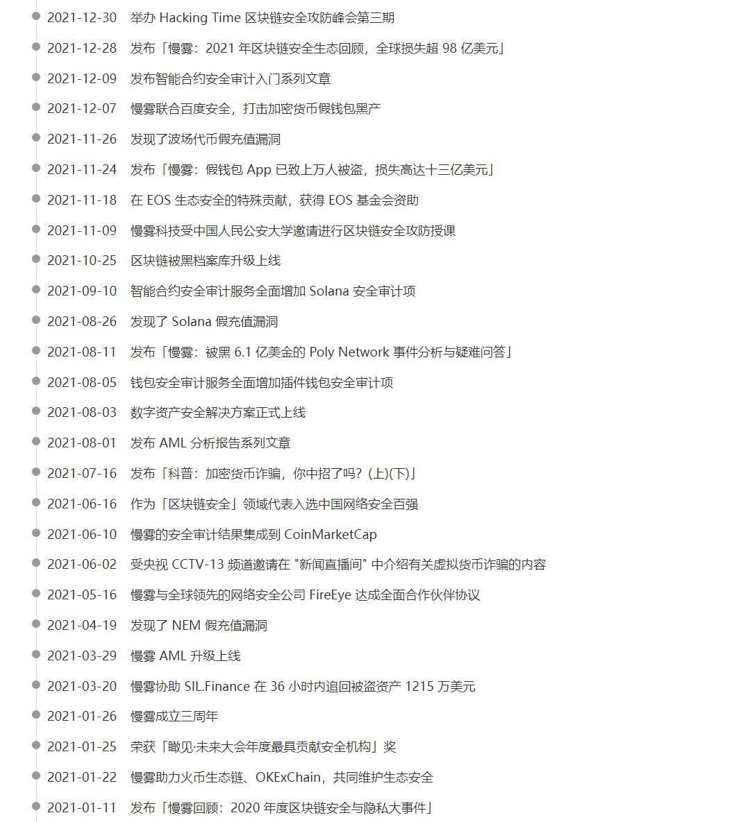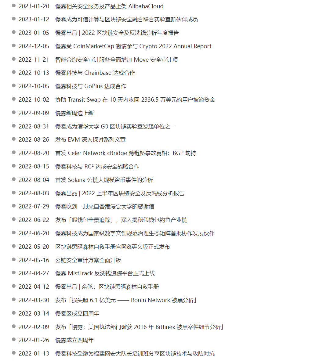 历年征程回首望。自成立以来,慢雾不仅在持续沉淀技术安全,还特别注意合规安全及生态安全的构建,广泛开放相关安全能力合作,与合作伙伴们一同共建更强的区块链安全生态!