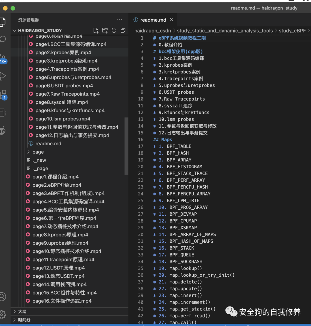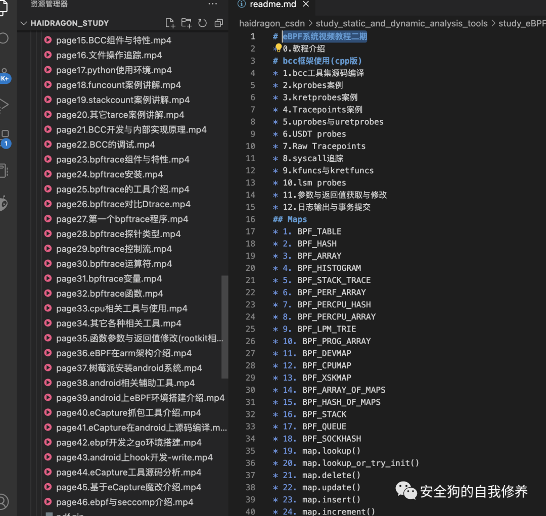 # eBPF系统视频教程## 基础教程* 1.课程介绍* 2.eBPF介绍* 3.eBPF工作机制(组成)* 4.BCC工具集源码编译* 5.编译安装内核源码* 6.第一个eBPF程序* 7.动态插桩技术介绍* 8.kprobes原理* 9.uprobes原理* 10.静态插桩技术介绍* 11.tracepoint原理* 12.USDT原理* 13.动态USDT* 14.调用栈回溯## BCC* 15.BCC组件与特性* 16.文件操作追踪* 17.python使用环境* 18.funcount案例讲解* 19.stackcount案例讲解* 20.其它tarce案例讲解* 21.BCC开发与内部实现原理* 22.BCC的调试## bpftrace* 23.bpftrace组件与特性* 24.bpftrace安装* 25.bpftrace的工具介绍* 26.bpftrace对比Dtrace* 27.第一个bpftrace程序* 28.bpftrace探针类型* 29.bpftrace控制流* 30.bpftrace运算符* 31.bpftrace变量* 32.bpftrace函数* 33.cpu相关工具与使用* 34.其它各种相关工具* 35.函数参数与返回值修改(rootkit相关)## 第三方工具与嵌入式平台* 36.eBPF在arm架构介绍* 37.树莓派安装android系统* 38.android相关辅助工具* 39.android上eBPF环境搭建介绍* 40.eCapture抓包工具介绍* 41.eCapture在android上源码编译* 42.ebpf开发之go环境搭建* 43.android上hook开发-write* 44.eCapture工具源码分析* 45.基于eCapture魔改介绍* 46.ebpf与seccomp介绍* 47.分析apk基础思路* 48.基于ebpf对so分析* 49.基于ebpf过反调试* 50.linux上的ebpf工具移植* 51.基于android源码方式运行ebpf* 52.对比linux其它分析工具(perf、ftrace)* 53.总结与eBPF相关资料