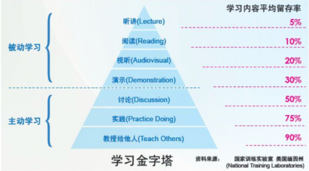 对于学习成长有一个知名的模型,叫学习金字塔,分别研究了 7 种学习方法,学习相同的知识,在两周后,对知识的留存率做了统计,用于区分不同的学习方法的效果,完整结果如图: