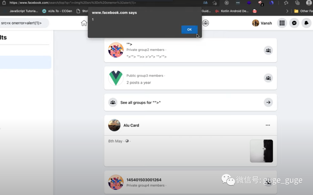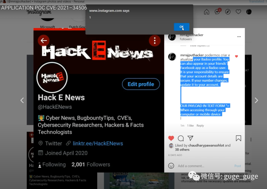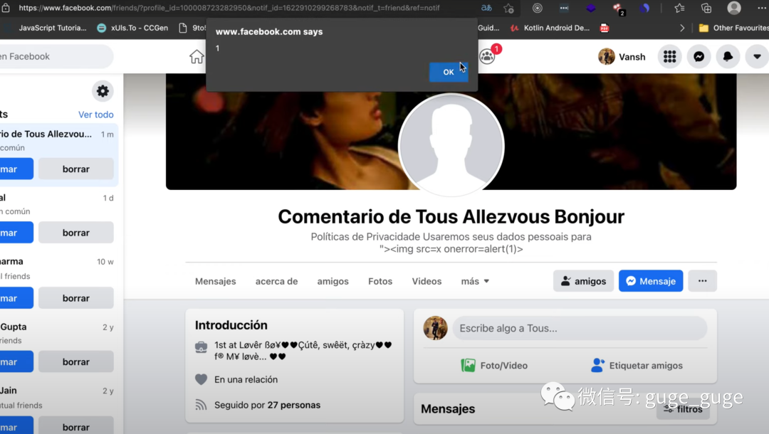 Facebook → 创建了一个具有不同语言名称和 XSS Payload 的个人资料,并在他检查个人资料后立即向受害者(使用 Edge)发送好友请求,他被攻击了。(因为自动翻译 XSS 弹出窗口)