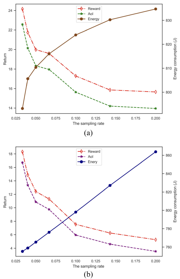 如图5(a)和图5(b)所示分别为基于VDN的算法在单无人机和多无人机场景下的数据收集性能。在本实验中,我们仍然采用固定抽样策略。数据收集性能的特征是预期回报,这是传感器节点平均AoI和无人机平均能耗的加权总和。当采样率λ小于或等于0.05时,传感器节点的平均AoI急剧下降,然后逐渐下降至平坦,同时,当λ≤0.05时无人机的平均能量消耗急剧上升,当λ>为0.05时消费继续上升。其原因如下。随着采样率的提高,更新包在每个信号产生,并由无人机更频繁地传输。因此,当更新数据包能够及时交付时,更新的样本间间隔减少,平均AoI变小。同时,无人机在传输上消耗的能量越来越多。在单无人机场景中,当采样率大于0.14时,由于无人机的飞行和中继能力都受到限制,AoI和能耗的降低率减慢并接近于零。在这种情况下,即使每个传感器节点的采样过程都是可预测的,也不可能任意降低传感器节点的平均AoI。与单列无人机场景相比,在多无人机场景中使用三架无人机时,每个传感器节点实现的平均AoI要小得多。当采样率小于0.143时,三架无人机花费的能量都更少,因为每架无人机只需要执行部分数据收集任务。当采样率达到0.2时,每架无人机比单无人机场景消耗更多的能量,因为它提供更多更频繁的新包产生,当3个无人机参与数据收集,传感器节点的平均AoI降低了70%,代价是在每架无人机上花费稍微更多的能量。此外,每架无人机的平均能耗几乎随着采样率的增加而呈线性增加。这是因为更新包的产生更频繁,每架无人机在包传输上按比例增加能量。在单无人机和多无人机的情况下,预期回报随着采样率的增加而单调下降,因为当权重系数为δ = 0.002时,传感器节点的平均影响范围对预期回报的影响大于每架无人机的平均能耗。