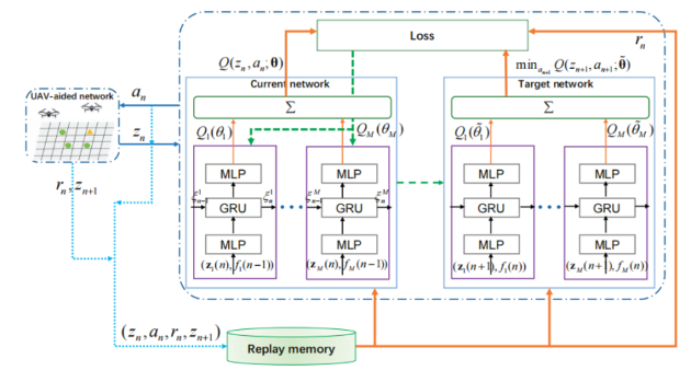 1)代理网络:如图2所示,使用每个代理网络估计局部动作值函数。它由一个输入的多层感知器(MLP)、一个门控递归单元(GRU)和一个输出的MLP组成。输入层使用多层感知器表示每个无人机m的当前观测动作对,并将其输入到GRU。为了减轻严重的部分可观察性,GRU层用于捕获对观测-动作历史τm (n)的长期和短期依赖,这是由隐藏状态表示的历史和当前观测组合形成的。它输出下一个隐藏状态,并将其提供给输出层,输出层使用MLP产生估计的局部动作值函数Qm(zm(n)、fm (n);θm)。将所有代理的动作价值函数求和,近似于全局动作值函数.