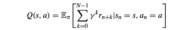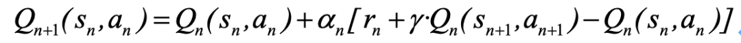 SARSA通过直接从环境中学习,可以实现无模型控制,而不知道状态转换分布。同时,它会根据现有的学习估计来更新估计。在状态sn下采取动作an并在此后遵循策略π的预期收益被定义为动作-价值函数: