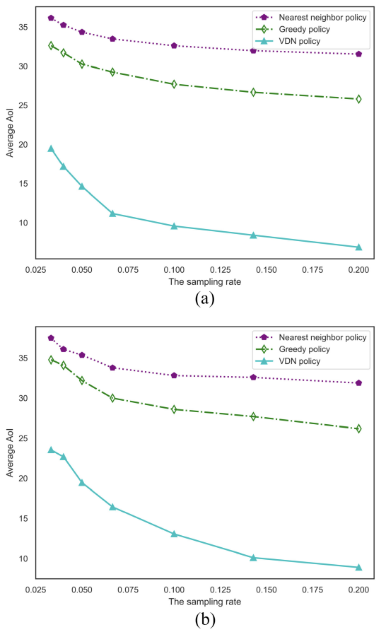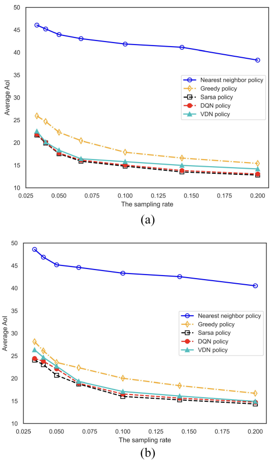 本文比较了所提出的学习算法SARSA和VDN与基线策略DQN、贪婪和最近邻在不同采样率下的AoI性能。具体来说,本文分别在图6(a)和图6(b)中绘制了上述算法对固定采样策略和随机采样策略的AoI曲线。从图6中可以看出,无论采用哪种算法,每个传感器节点的平均AoI都随采样率的增加而单调地减小。这些算法中,SARSA的表现最好,因为它可以大近似地实现最小解,通过集中的训练和执行,DQN实现的AoI值略小于SARSA。由于部分观察结果,VDN的表现明显低于DQN。基于学习的策略:SARSA、VDN和DQN,优于两种非基于学习的策略,即贪婪策略和最近邻策略,因为它们可以通过不断地从环境中收集信息来学习做出更好的选择。与学习策略不同的是,贪婪策略和最近邻策略在决策过程中分别只利用所有传感器节点的AoI值和位置。控制无人机飞到最大传感器节点的贪婪策略存在轻微的性能下降。最近邻策略根据传感器节点之间的相对距离来选择无人机的飞行方向,并达到了最差的AoI性能。通过对比图6(a)和图6(b)这两个子图,我们可以看到,无论使用哪种算法,随机采样都会降低平均AoI。通过随机抽样,更新数据包的生成实例是不可预测的。在这种情况下,三种基于学习的算法:SARSA,VDN和DQN,利用每个传感器节点的采样历史来做出决策,因此它们的AoI性能略有不同。