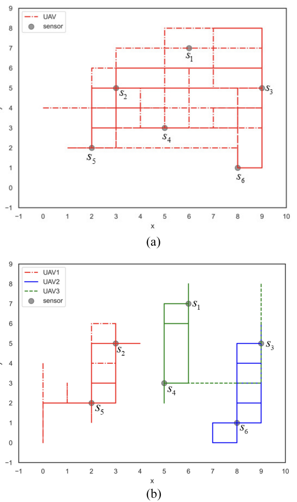 如图4(a)和图4(b)所示,本文在采用基于VDN的算法进行固定采样时,分别绘制了单无人机和多无人机场景的示例无人机飞行轨迹。6个传感器节点位于矩形区域,从图4(a)中,一架无人机从6个传感器节点中收集数据。可以看出,无人机在每一步中选择四个方向中的一个,并垂直或水平地飞到下一个目标传感器节点。因此,无人机在6个传感器节点周围飞行,并收集它们定期产生的更新数据包。在多无人机场景中,三架无人机被派去执行数据收集。标记为无人机1、无人机2和无人机3的三架无人机的飞行轨迹分别用红点虚线、蓝色实线和绿色虚线表示。通过从环境中学习,这三架无人机应该协同进行数据收集。如图5(b)所示,每架无人机只负责该区域的一小部分。具体来说,无人机1在传感器节点 2和传感器节点 5周围飞行,无人机2在传感器节点 3和传感器节点 6之间来回飞行。传感器节点 1和传感器节点 4由无人机3采集。