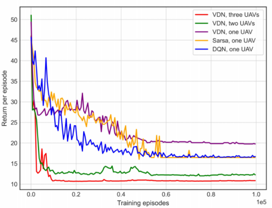 图3显示了三种基于学习的数据收集算法:SARSA、VDN和DQN的收敛性能。本实验采用固定采样。随着训练次数的增加,这三种算法都会逐渐波动并收敛。与DQN和VDN两种DRL策略相比,当一架无人机进行数据采集时,SARSA策略收敛速度更慢,收敛后获得的平均回报更小。当算法运行约8000次时,DQN获得了几乎与SARSA相同的平均回报,这可以渐近地接近最优解。相比之下,VDN比DQN表现出更剧烈的波动,并获得了更高的平均回报,因为它只利用了部分观测结果,并以分布式的方式执行。当更多的无人机作为代理时,VDN的收敛速度更快,并获得了更低的回报。如图4所示,当使用三架无人机时,经过1000次训练后,VDN几乎收敛。这意味着,当更多的代理参与协作学习环境时,该算法呈现出相当快的收敛性。因此,每个传感器节点可以更频繁地收集,每架无人机的平均AoI和能耗都降低了,导致平均回报更小。