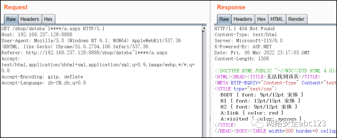 本地搭建一个IIS6.0、Win2003环境,看一下如何通过IIS短文件名猜解得到服务器文件或者文件夹地址。接下来构造如下两个URL: