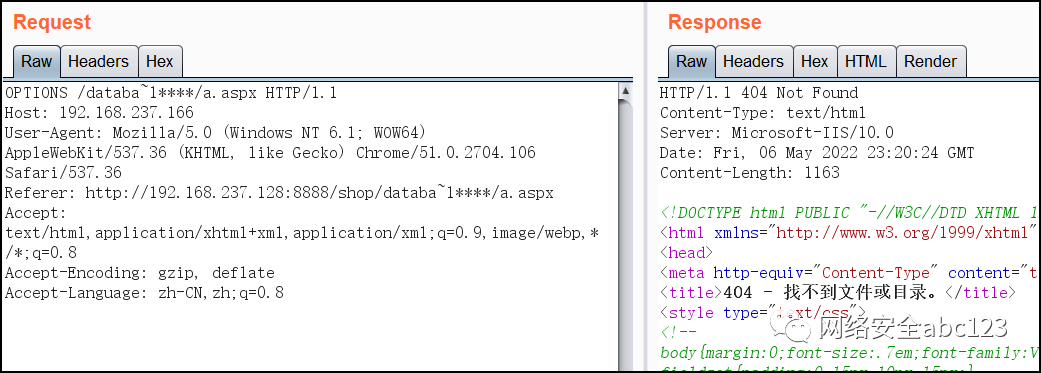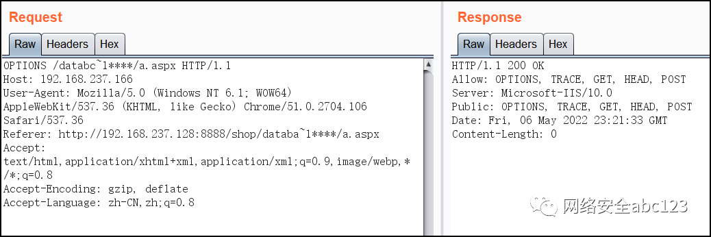 由此可知,通过以上判断方法,可以得到逐步猜解出低版本IIS网站目录下长文件名的前6位字符及后缀。但对于IIS较新版本,GET请求是判断不出短文件名的,需要借助OPTIONS请求或者TRACE请求,HEAD请求、GET请求、POST请求都不行。