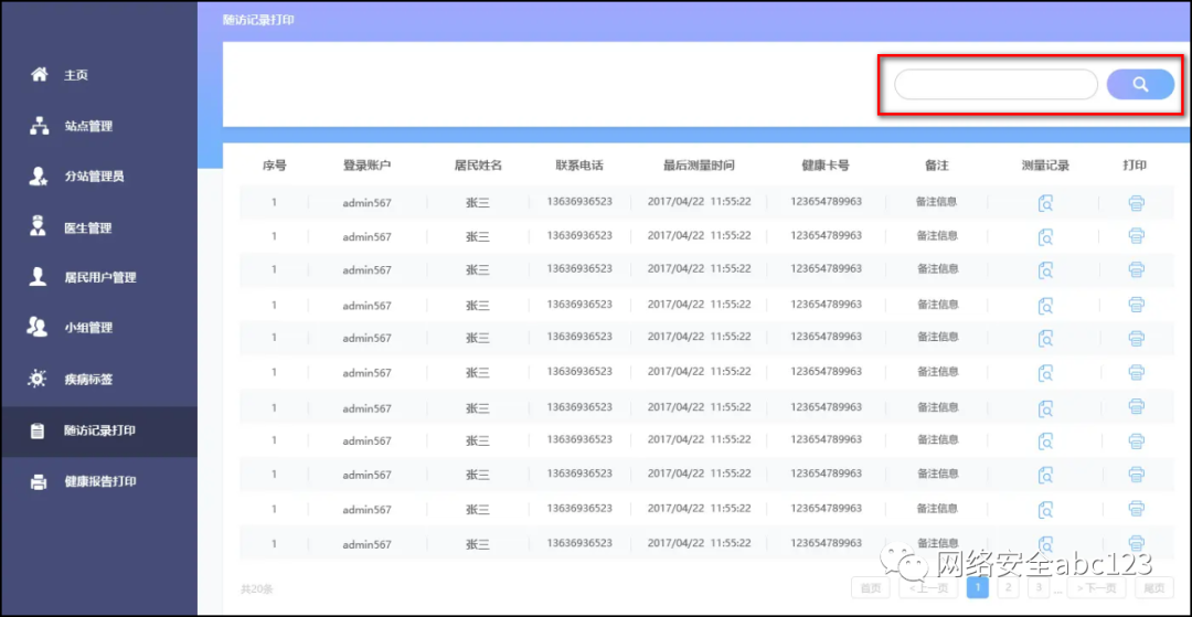 于是两个未授权访问页面就出现了,对这两个页面的漏洞进行深度挖掘,追踪页面中的js链接地址。patient.aspx显示如下页面(图片是本地虚拟机环境),搜索框存在SQLServer注入漏洞,而且是sa权限,直接拿到了服务器权限。