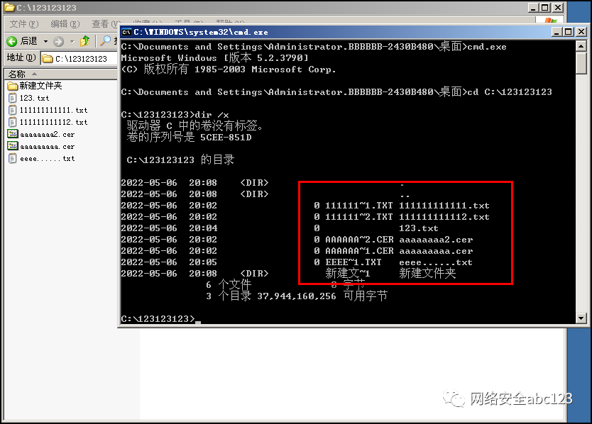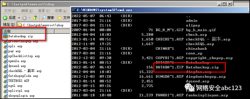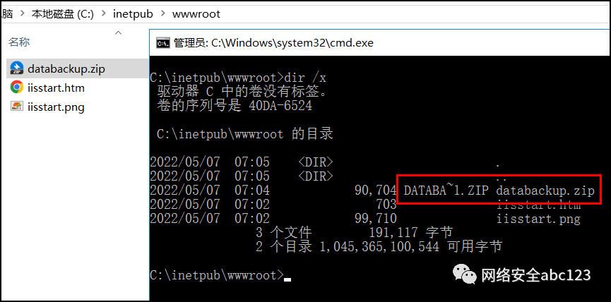 假设IIS中间件网站目录下有Databackup.zip这样一个网站备份文件,使用dir /x查看,可以得到短文件名为DATABA~1.zip。如果在红队项目过程中,得知网站下有一个DATABA为前缀的文件名,那么就可以很容易猜到完整的数据库文件名database.zip或者databackup.zip,那么就可以直接下载数据库了,这对于红队项目是非常有帮助的。