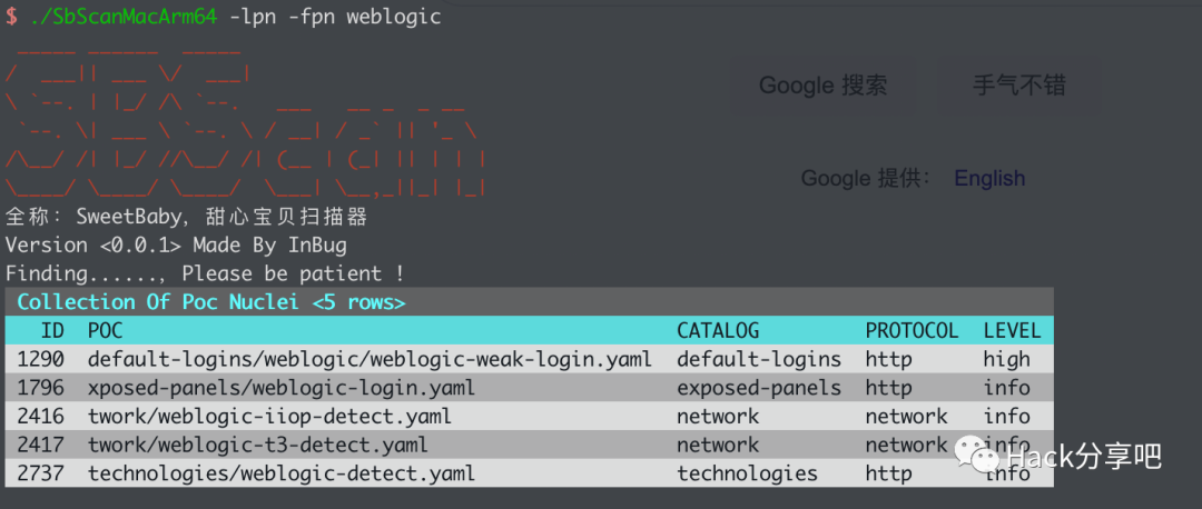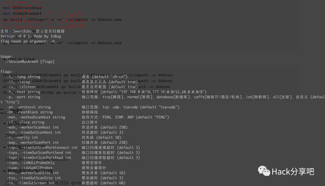 ./SbScan -h 192.168.188.0/24 -p 80,22,81-89./SbScan --lpn --fpn weblogic0x03 编译