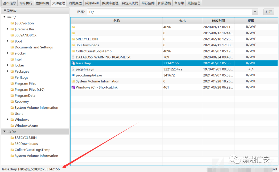 这里我利用procdump把lsass进程的内存文件导出本地,再在本地利用mimikatz读取密码,上传procdump64.exe并下载lsass.dmp