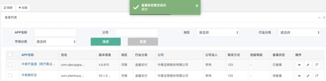 移动端安全管控平台对APP的备案可分为自主备案和企业备案两种方式。个人或团体可对自己开发运营的APP进行在线备案,企业可对自有APP进行批量上传备案。APP上传后可自动关联企业工商信息获取企业地址、企业类别、企业联系人、联系方式等信息,并进行备案状态审核。