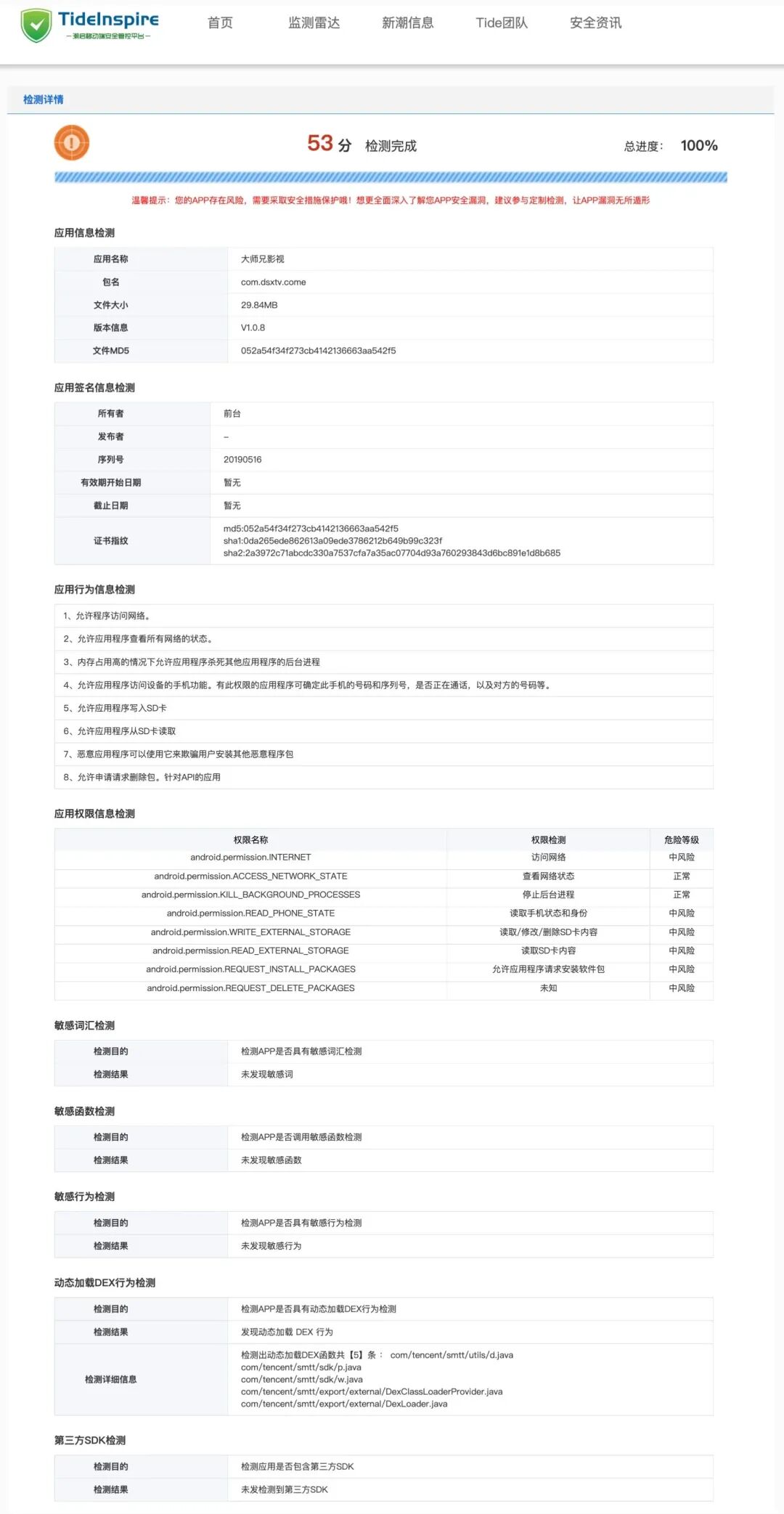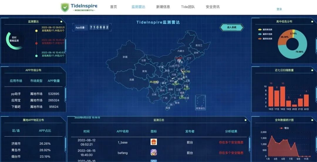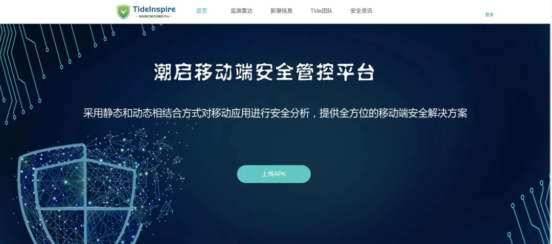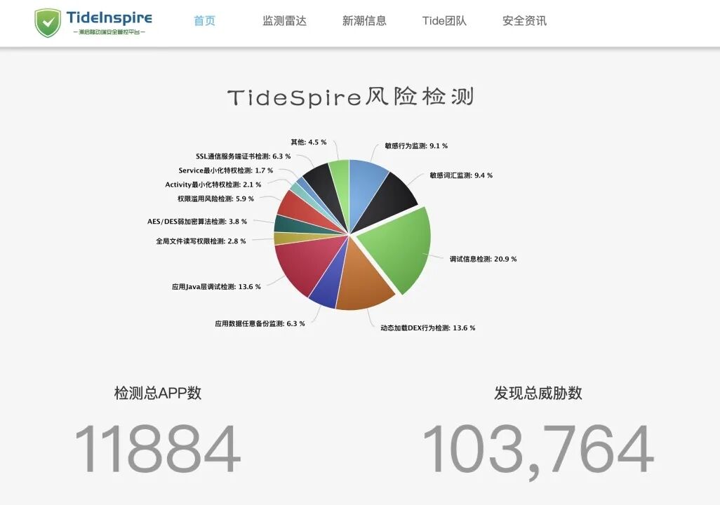 TideInspire(潮启)是由新潮信息Tide安全团队自主研发推出的一款移动端安全管控平台。主要实现移动应用APP备案管理、APP生存周期管理、移动应用基本信息检测、移动应用恶意行为检测、移动应用安全规范检测、移动应用渠道监测、钓鱼伪造APP安全监测、通报预警服务、威胁感知服务等,并能对移动应用APP进行源码安全漏洞检测、协议安全漏洞检测、数据安全检测等全方面自动化安全检测服务。